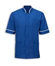 Men's mandarin collar tunic. It features comfortable durable fabric with a concealed zip front, double action back and vents. Two hip pockets, one chest pen pocket. Various colours with contrasting piping.
